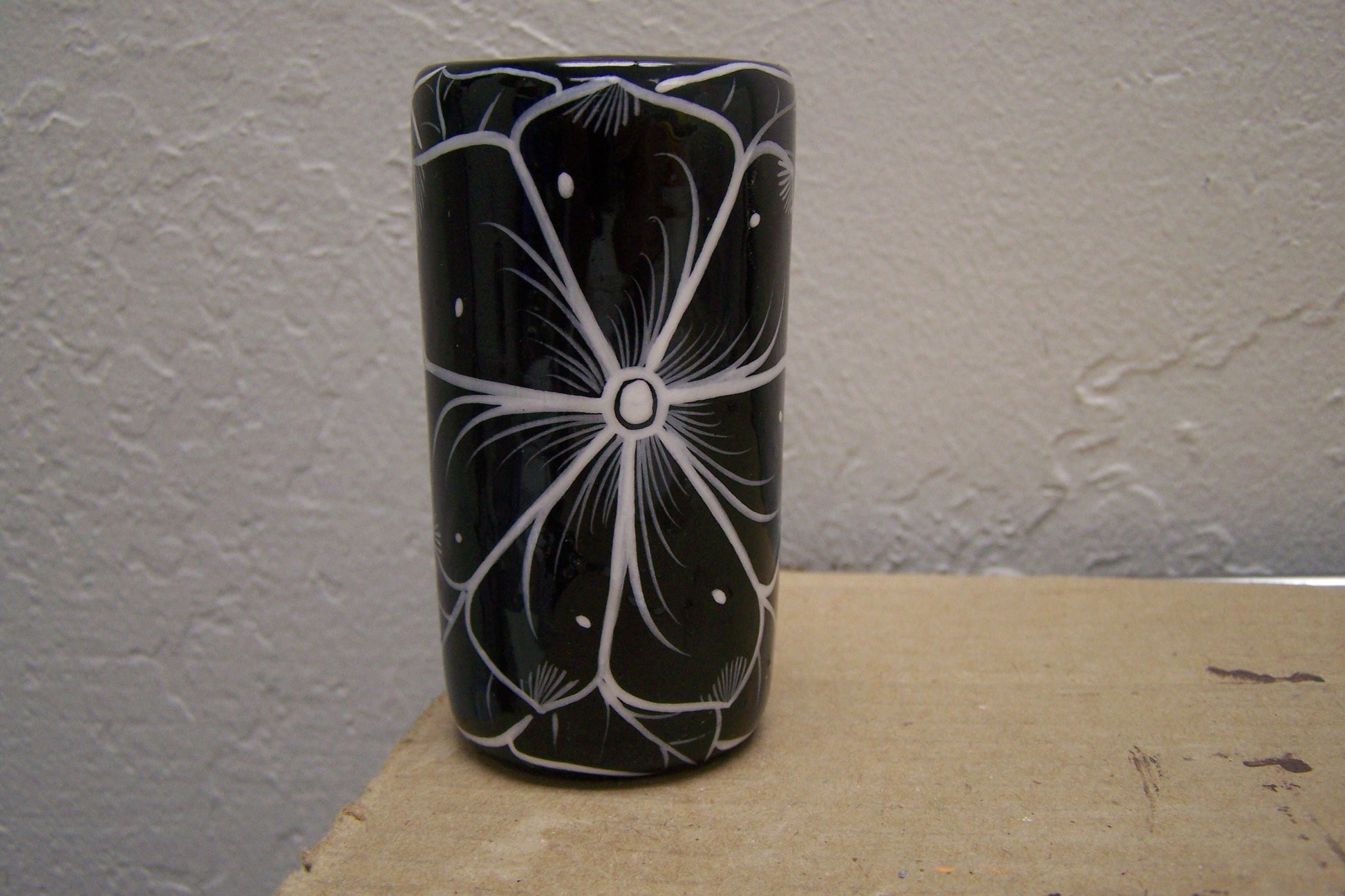 This unique hand crafted shot glass measures 3" tall and 1.5" across at the top. You will receive the exact piece as shown in the photos.